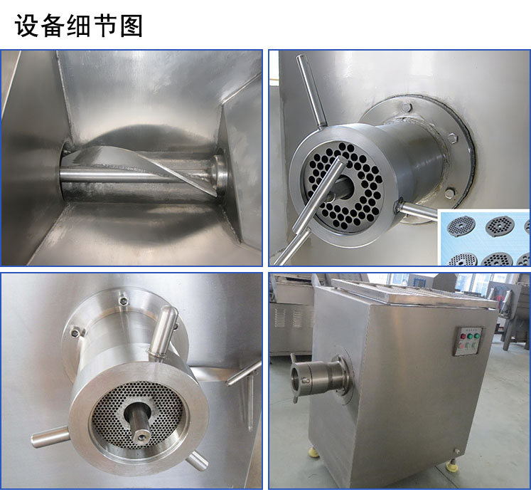 絞肉機為系列產(chǎn)品:工作時利用轉(zhuǎn)動的切刀刃和孔板上孔眼刃形成的剪切作用將原料肉切碎,并在螺桿擠壓力的作用下,將原料不斷排出機外。可根據(jù)物料性質(zhì)和加工要求的不同,配置相應(yīng)的刀具和孔板,即可加工出不同尺寸的顆粒,以滿足下道工序的工藝要求。